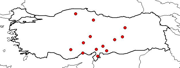 | Based on Vilayets: | OSMANİYE, GAZİANTEP, KASTAMONU, AMASYA, ELAZIĞ, ERZİNCAN, HATAY, İÇEL, KAYSERİ, MALATYA, KAHRAMANMARAŞ, NİĞDE, KARAMAN| Taksonun kare düzeyinde dağılımı bulunamadı.
