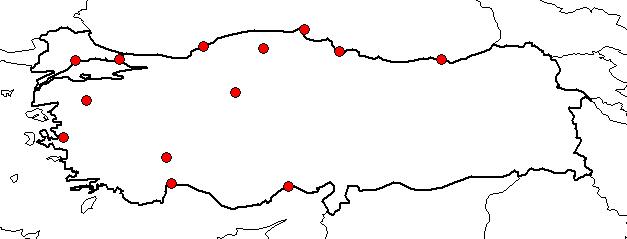 | Based on Vilayets: | İSTANBUL, ZONGULDAK, KASTAMONU, ANKARA, ANTALYA, BALIKESİR, ISPARTA, İÇEL, İZMİR, SAMSUN, SİNOP, TEKİRDAĞ, TRABZON| Taksonun kare düzeyinde dağılımı bulunamadı.
