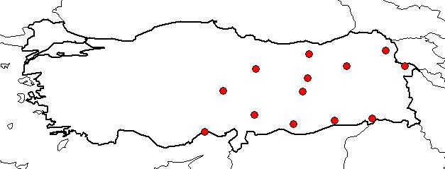 | Based on Vilayets: | IĞDIR, KARS, MARDİN, ŞIRNAK, AĞRI, ELAZIĞ, ERZURUM, GÜMÜŞHANE, İÇEL, KAYSERİ, KAHRAMANMARAŞ, SİVAS, TUNCELİ, ŞANLIURFA| Taksonun kare düzeyinde dağılımı bulunamadı.